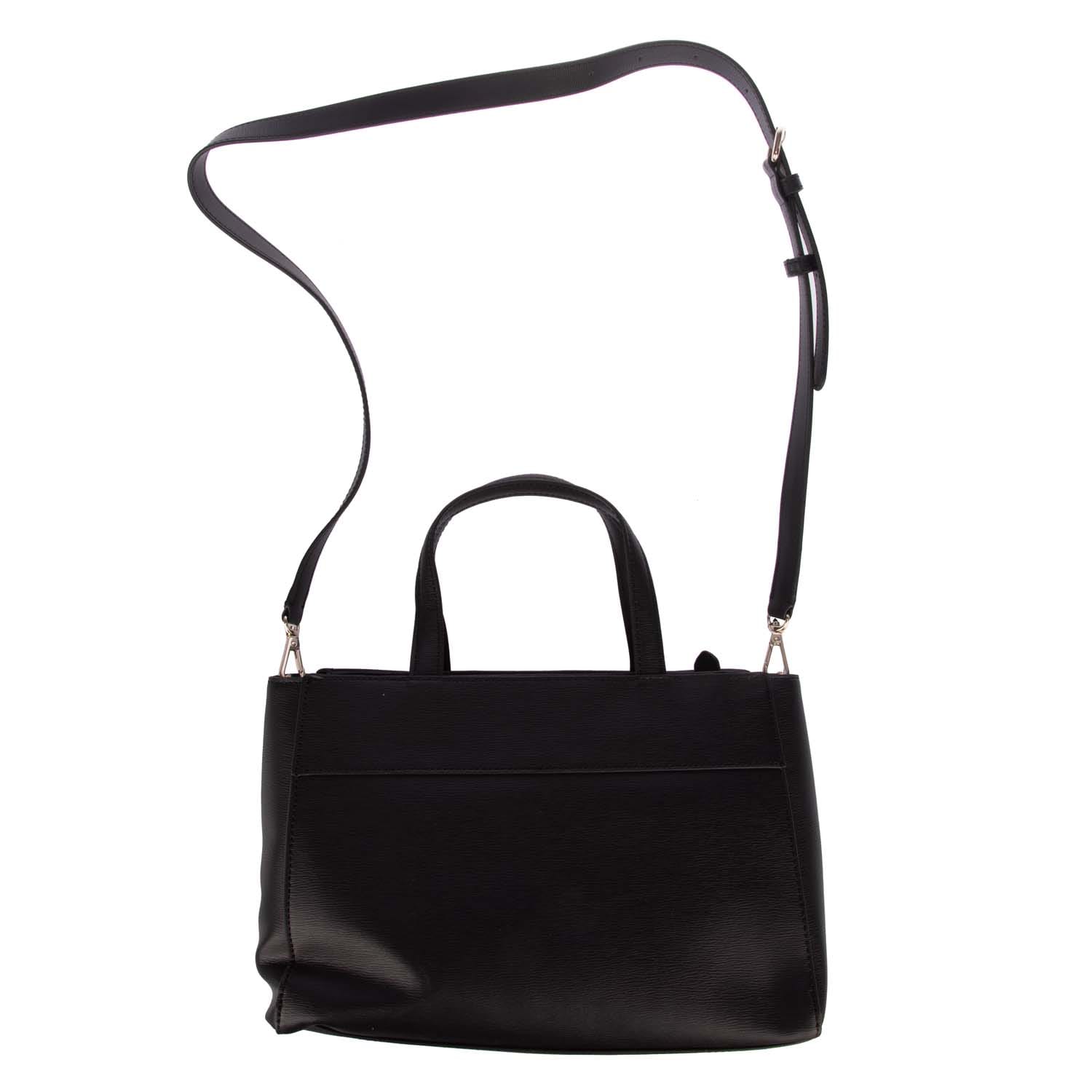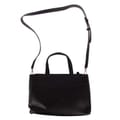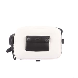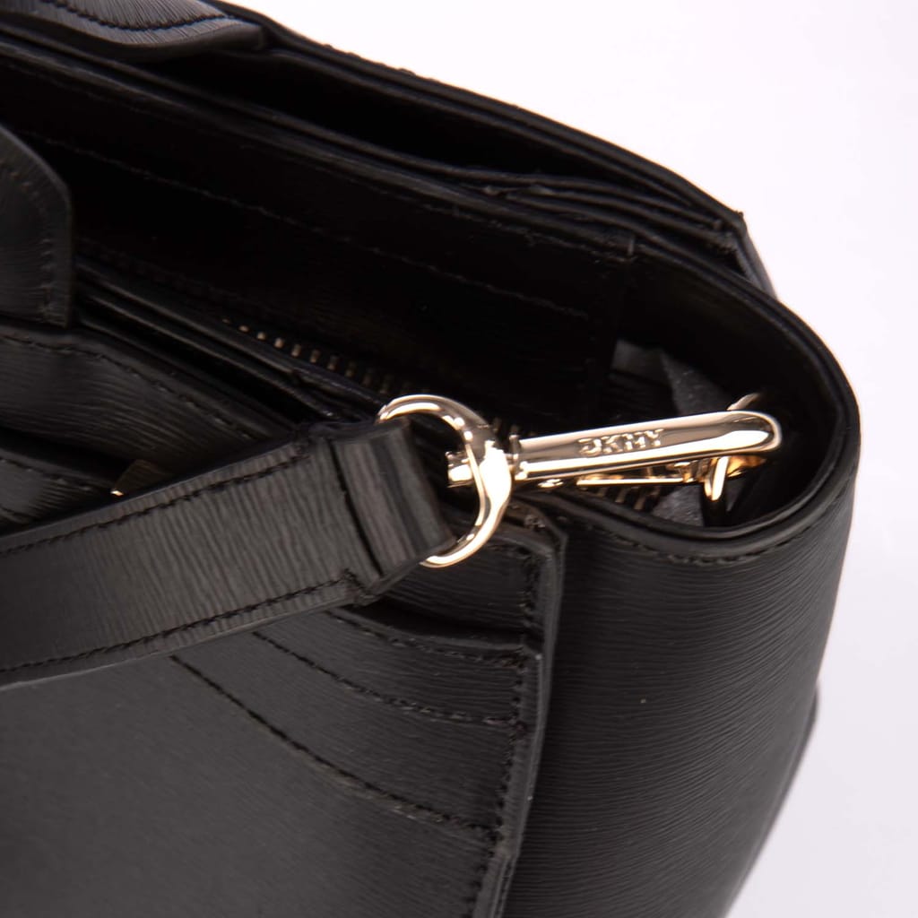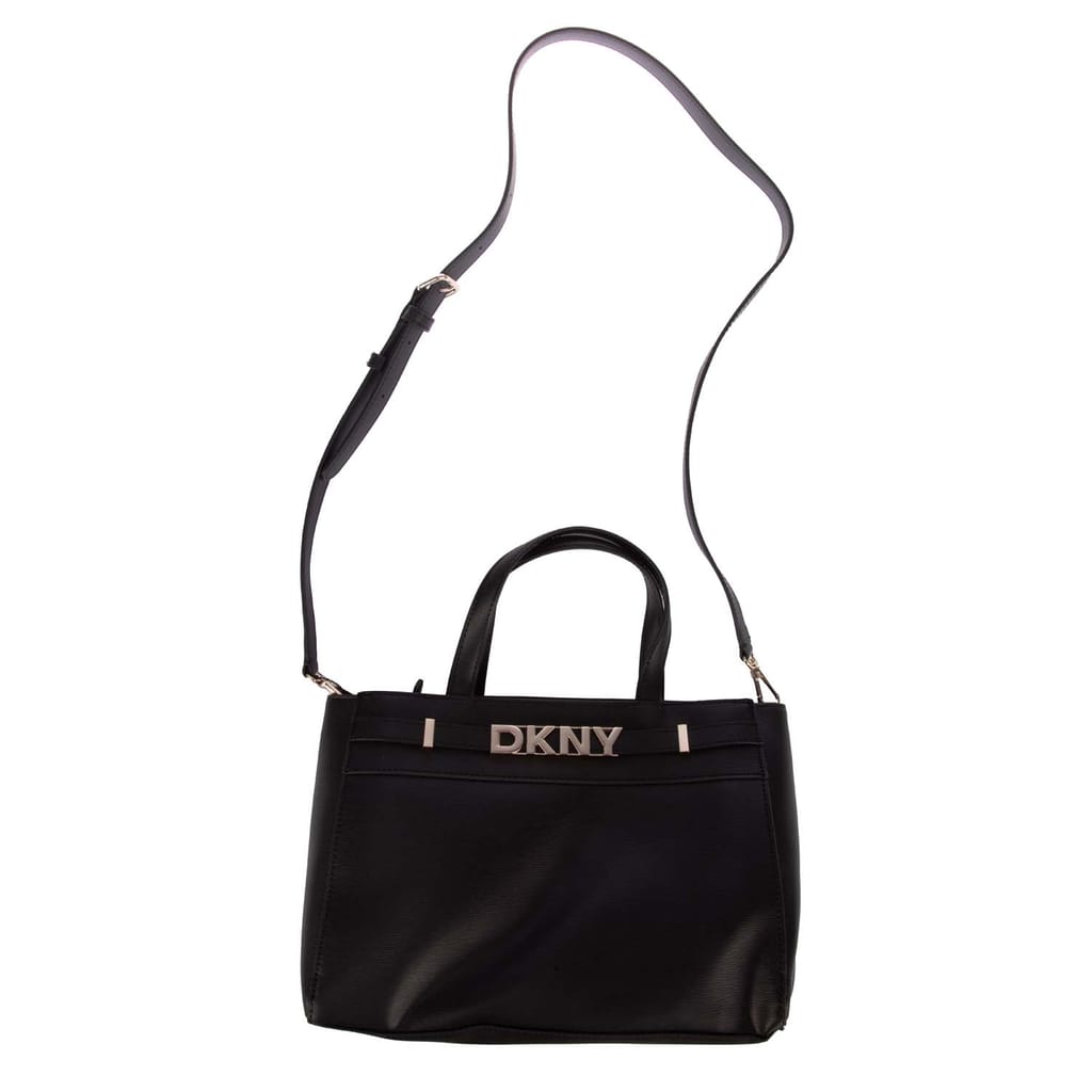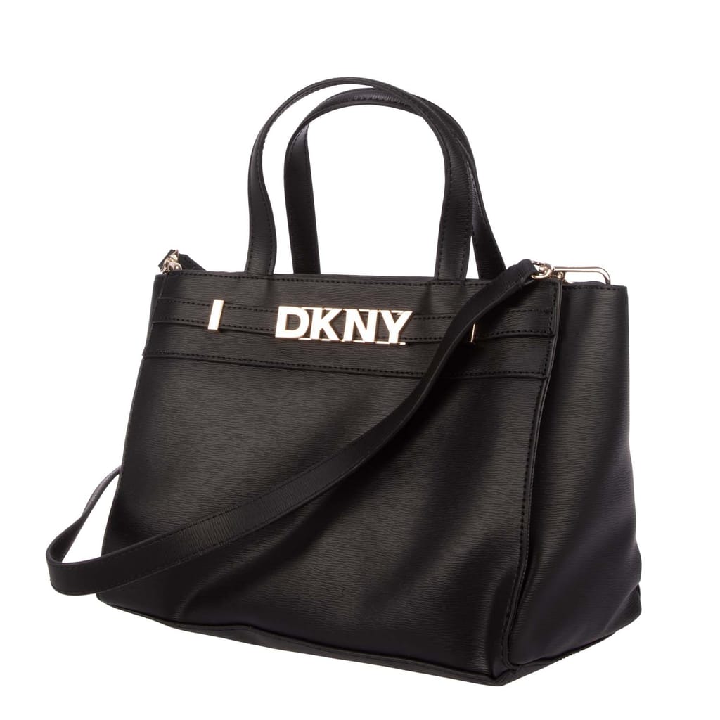 Top handle and adjustable strap. Multiple compartments, with a zippered one in the middle. Gold-colored hardware, including the DKNY logo on the front. -