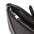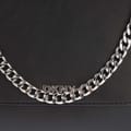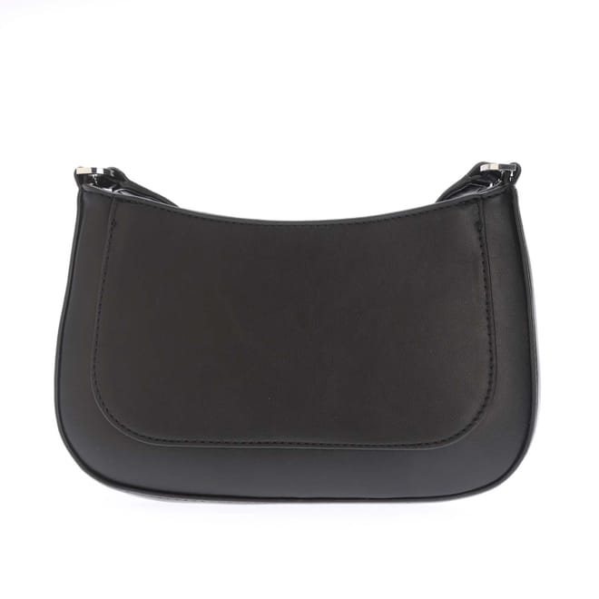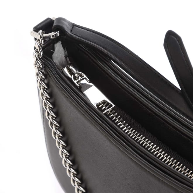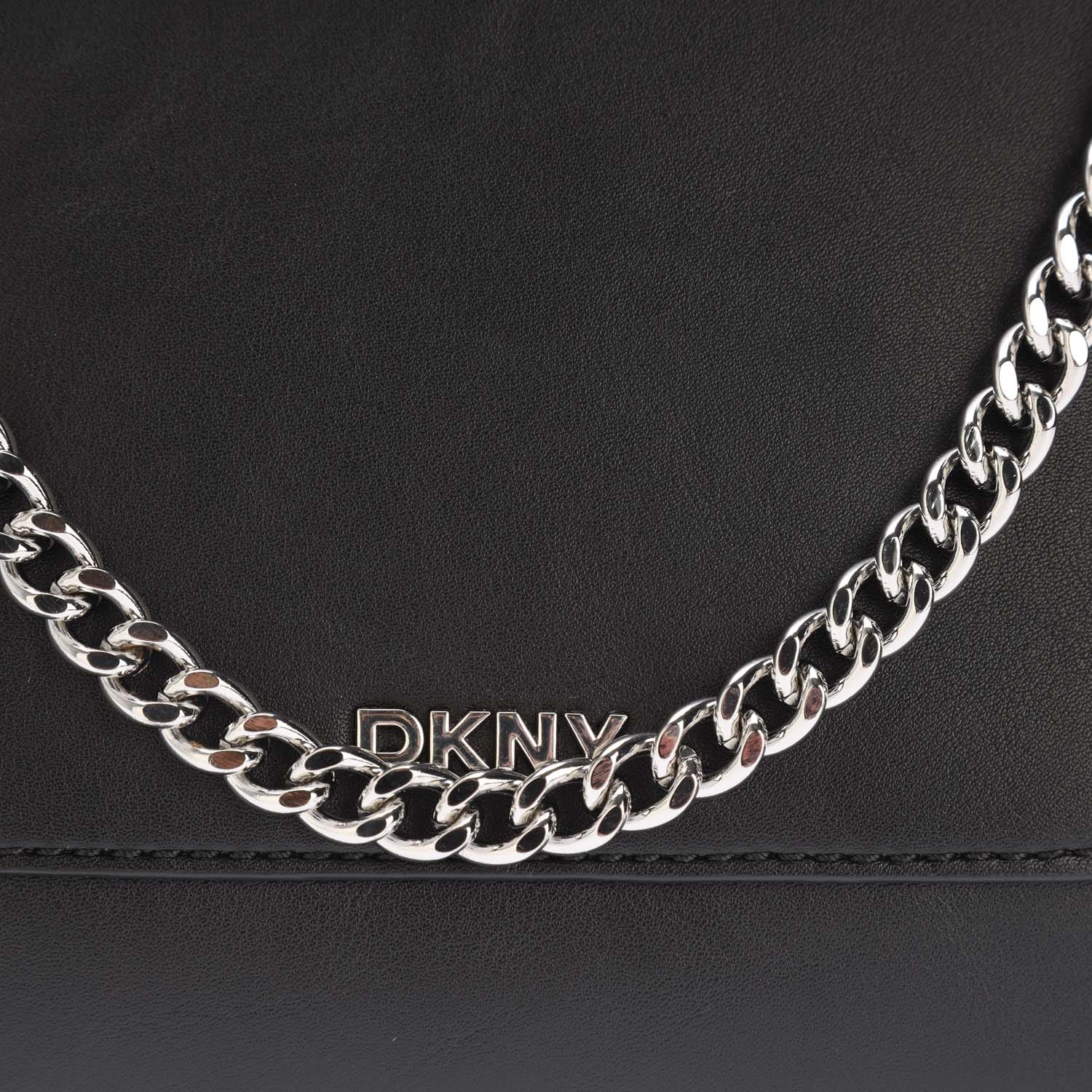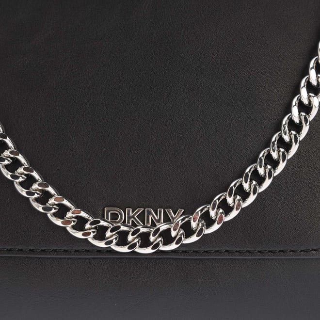 Gold-toned chain detail on the front flap. Shoulder strap. Three main compartments. Interior pockets. DKNY logo. -