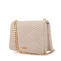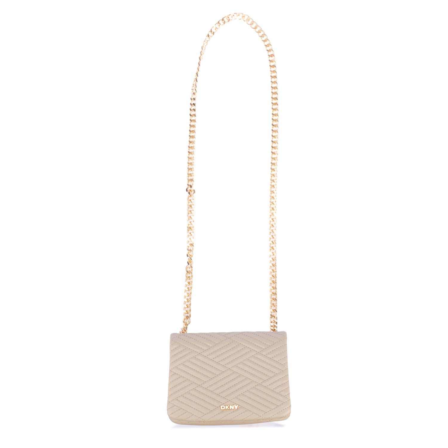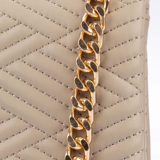This stylish accessory is a leather handbag featuring a chevron-quilted pattern, a gold-tone chain-link strap, and a flap-top closure. -