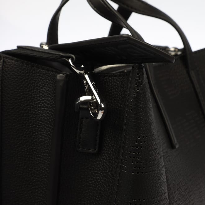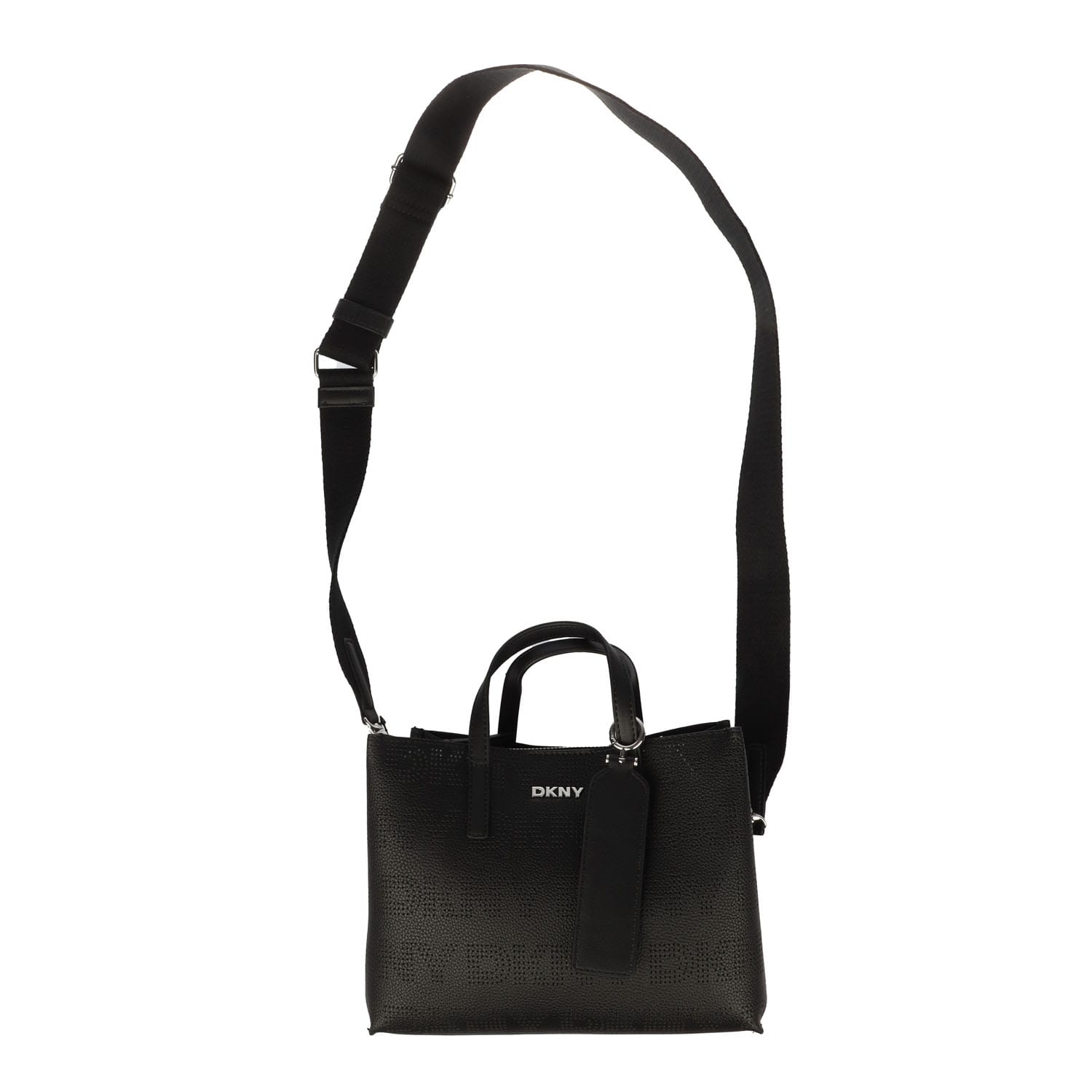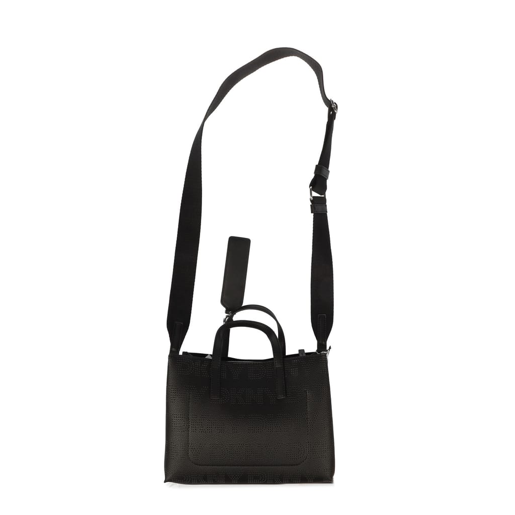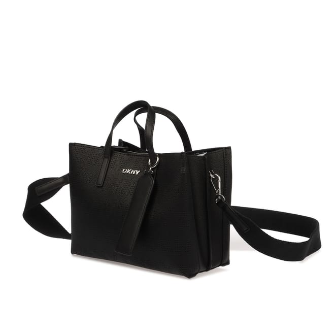 Top handles. Three main compartments. Interior pocket. Perforated pattern over a solid black material. DKNY metallic plaque on the front. -