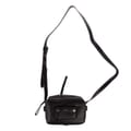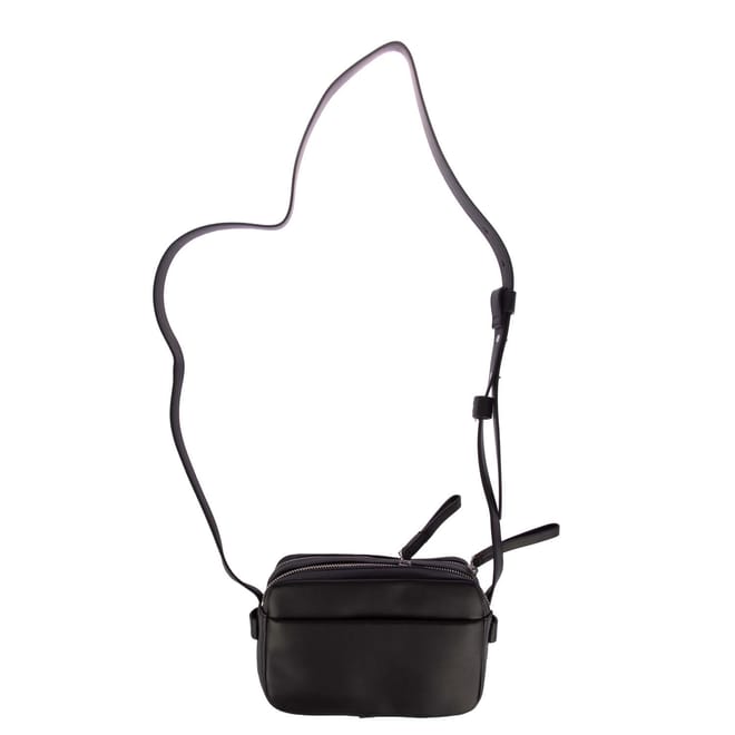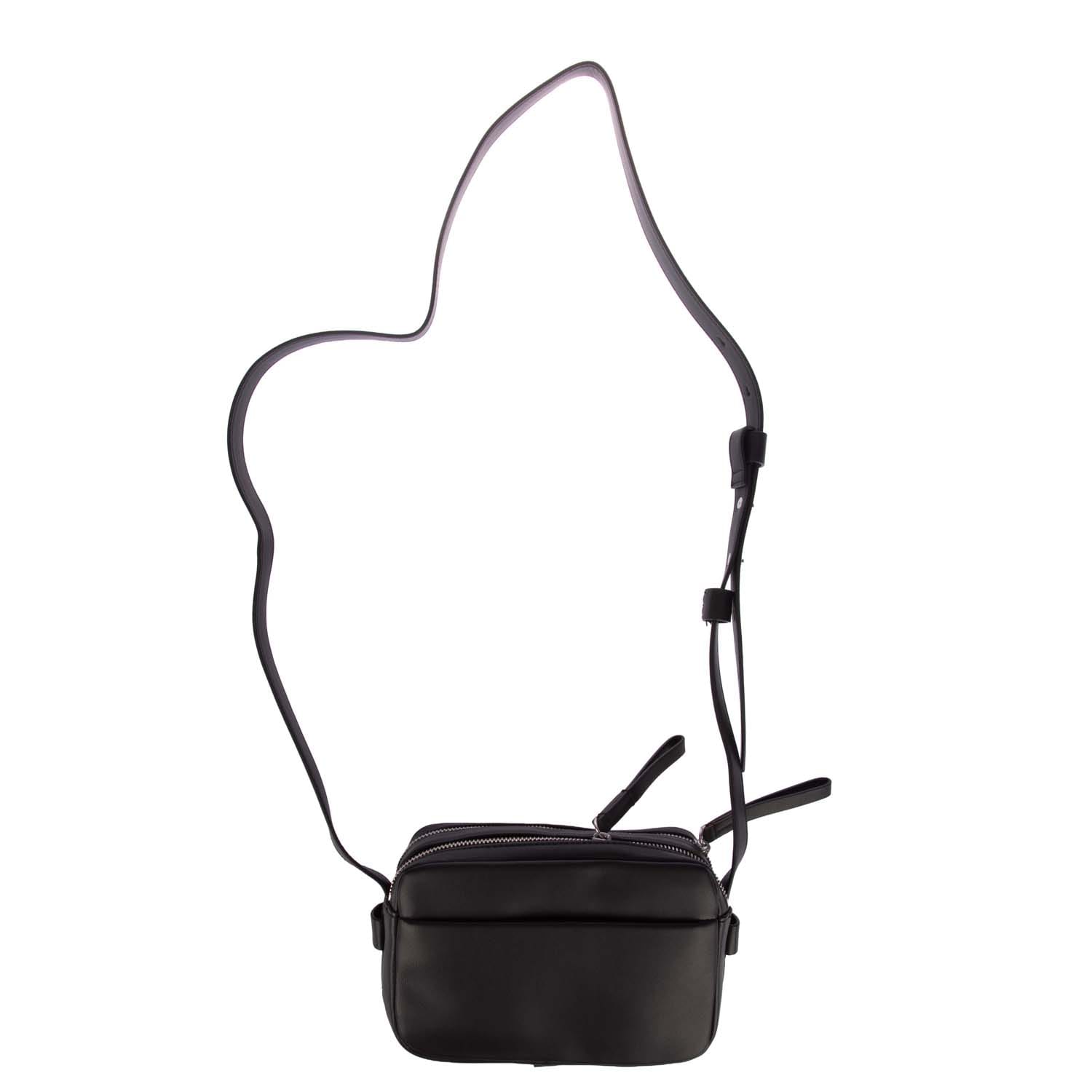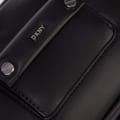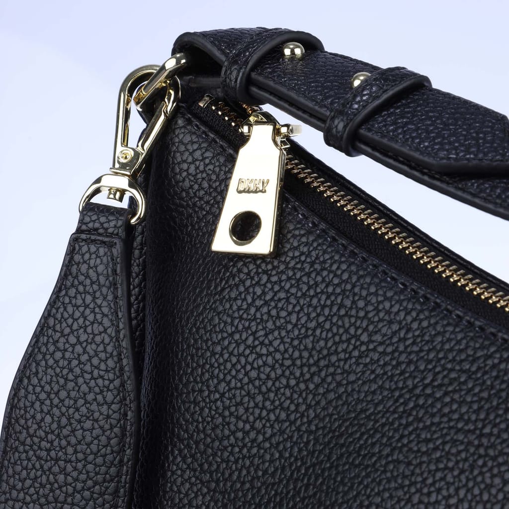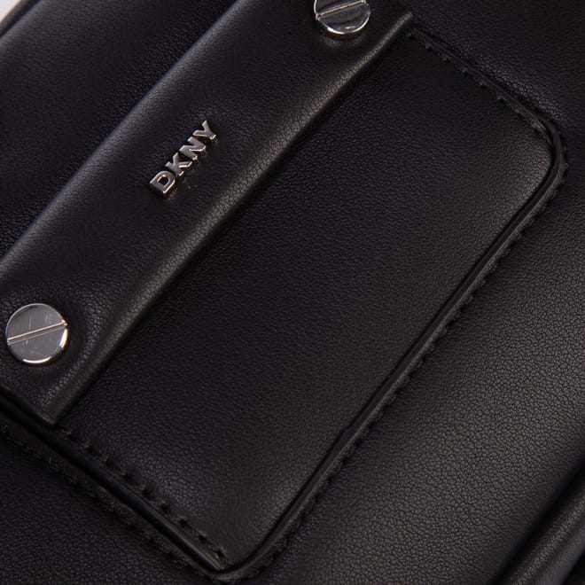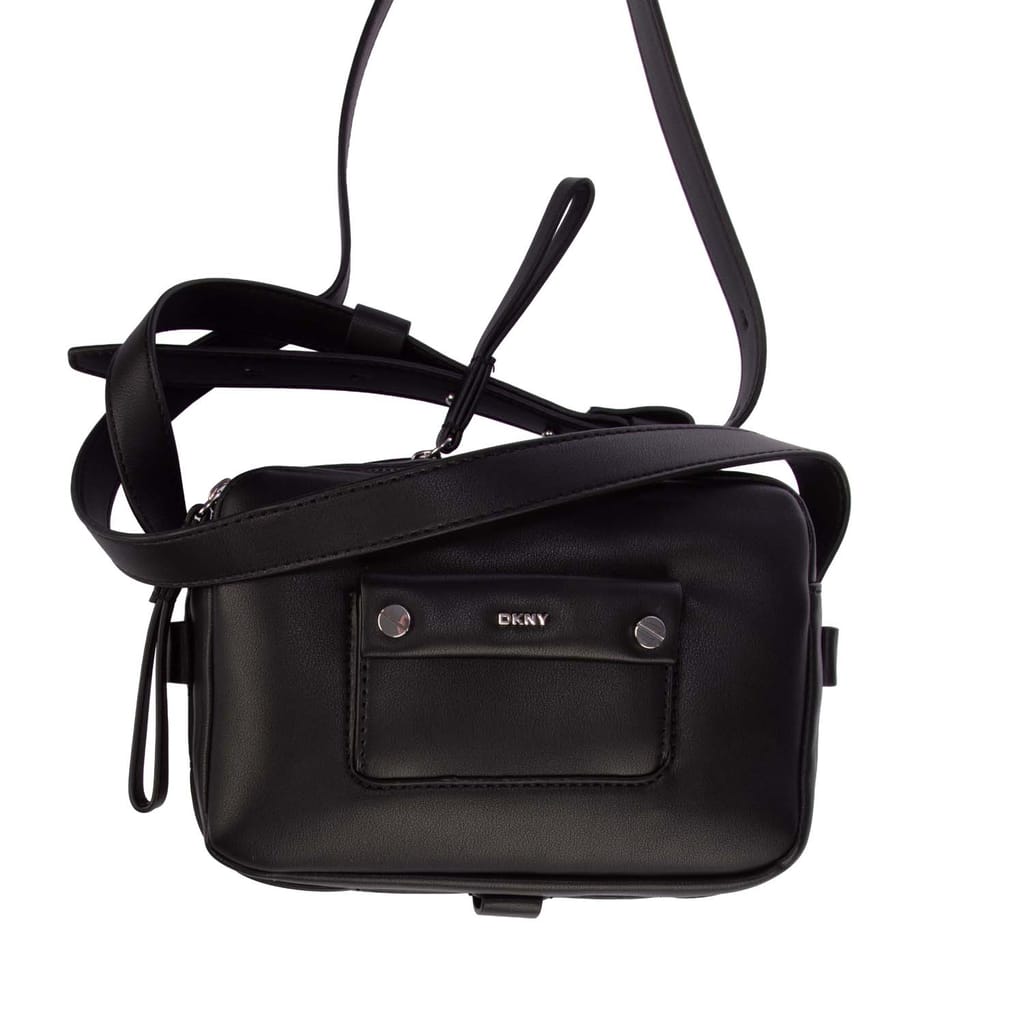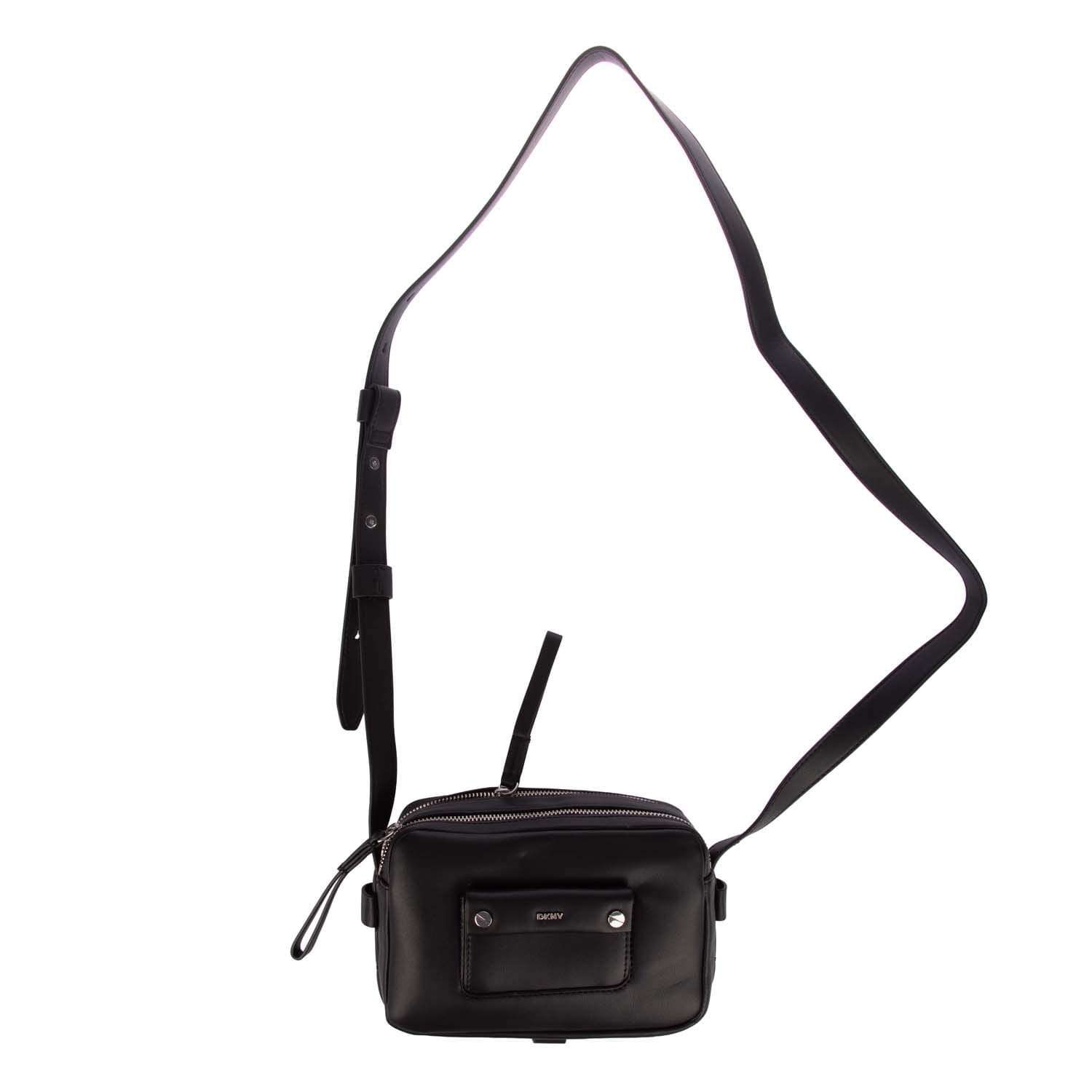 Adjustable crossbody strap. Two main zip compartments. Interior pockets. Small front pocket with DKNY logo and silver-tone hardware. -