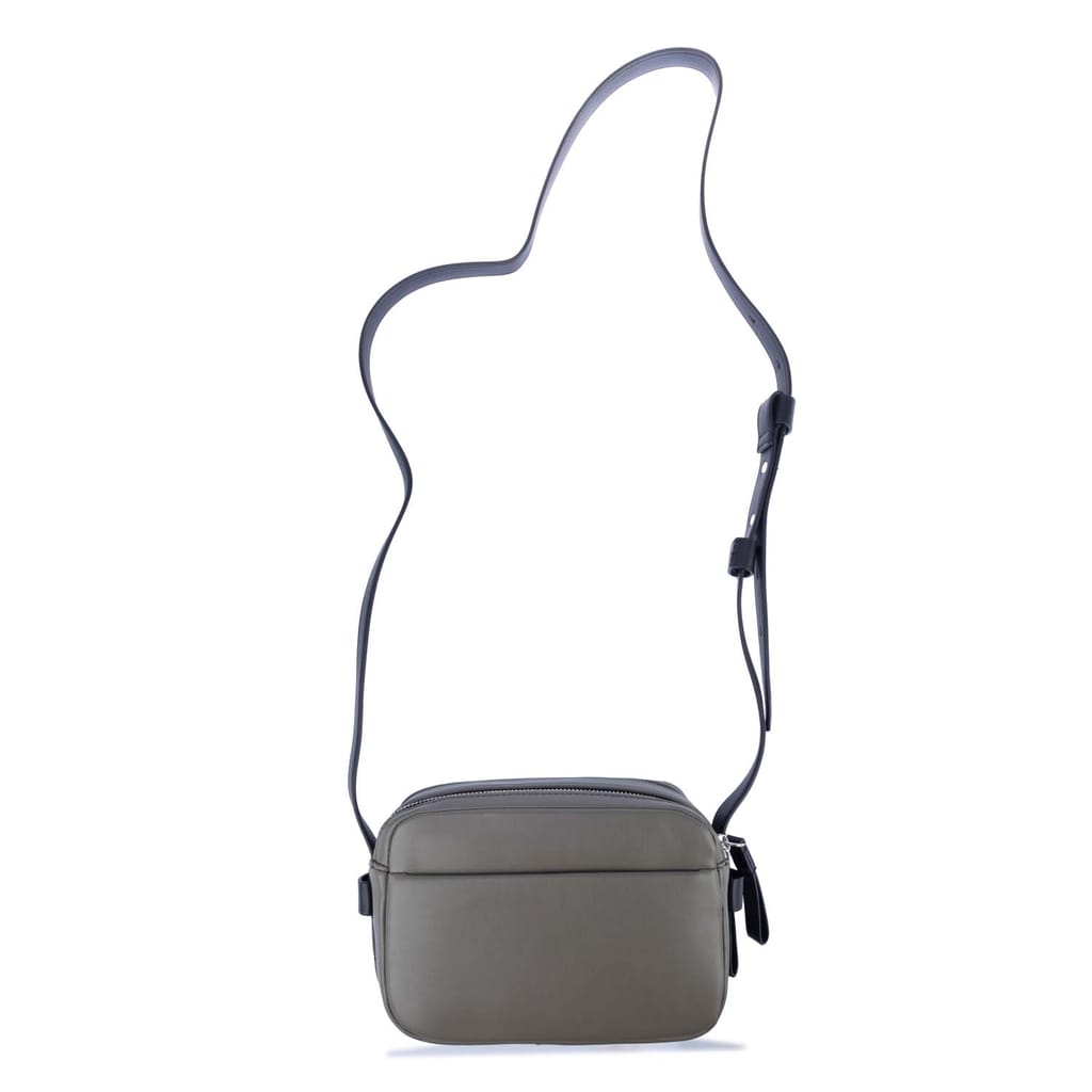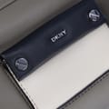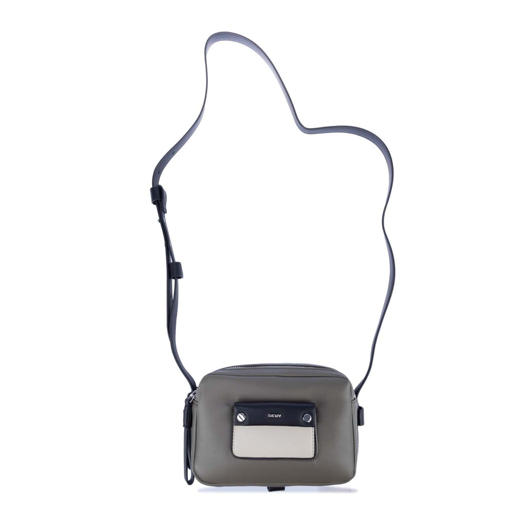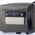 Adjustbale crossbody strap. Two main zip compartments. Interior pockets. Small front pocket with DKNY logo and silver-tone hardware. -