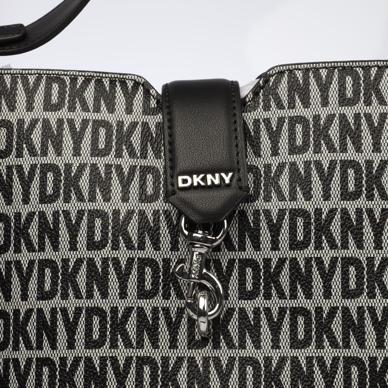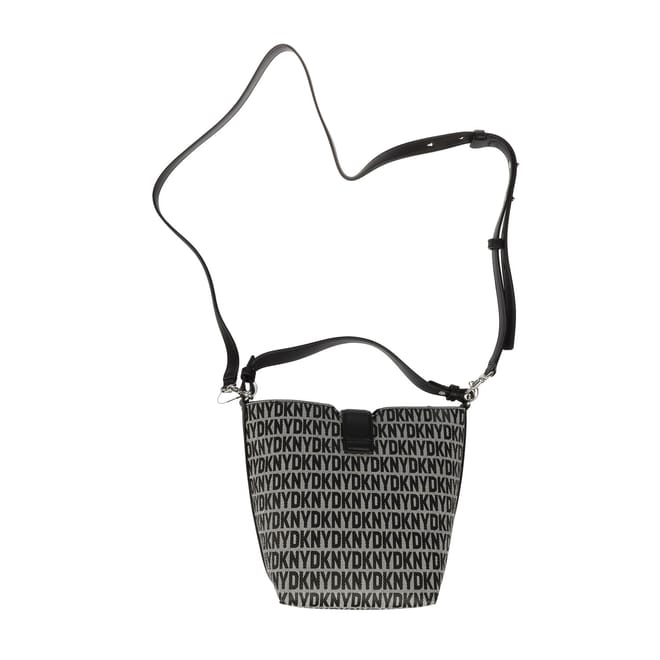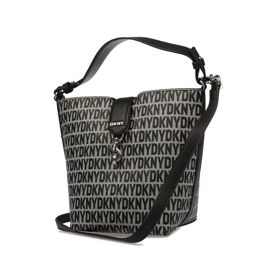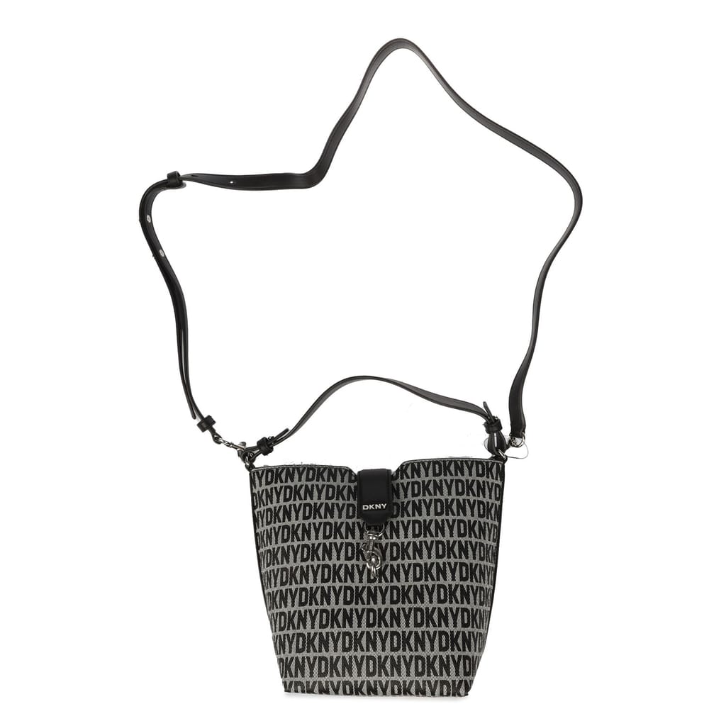 The DKNY Taira Bucket Bag Logo is a stylish and practical handbag designed for women. Made of faux leather with a grey exterior and black logo, this medium-sized bag features a fold-over strap with a magnetic snap-button closure for secure access. The top handle design with a 4-inch drop makes it easy to carry, while the interior fabric lining is suitable for everyday use. Additionally, this bucket bag includes a zip pocket and other pockets for organization. -