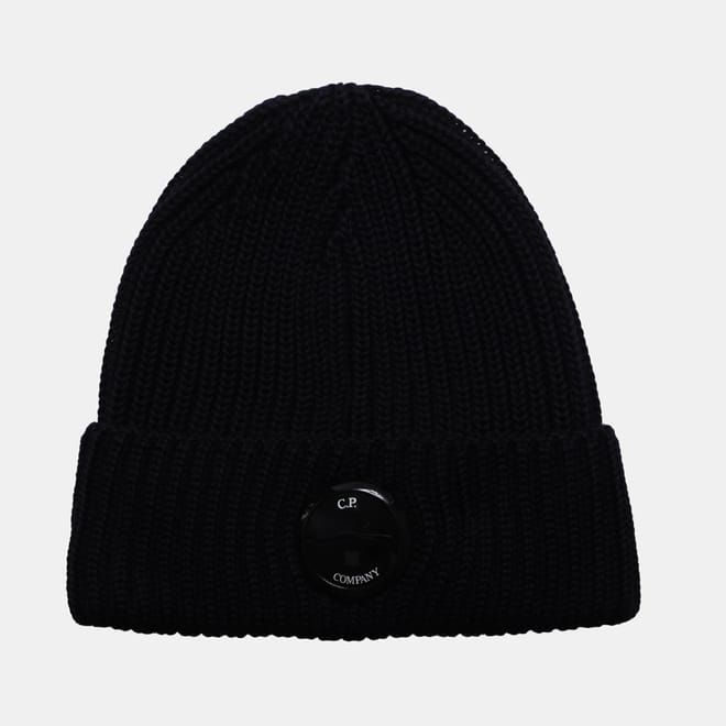 C.P. Company Extra Fine Merino Wool Lens Beanie in navy.