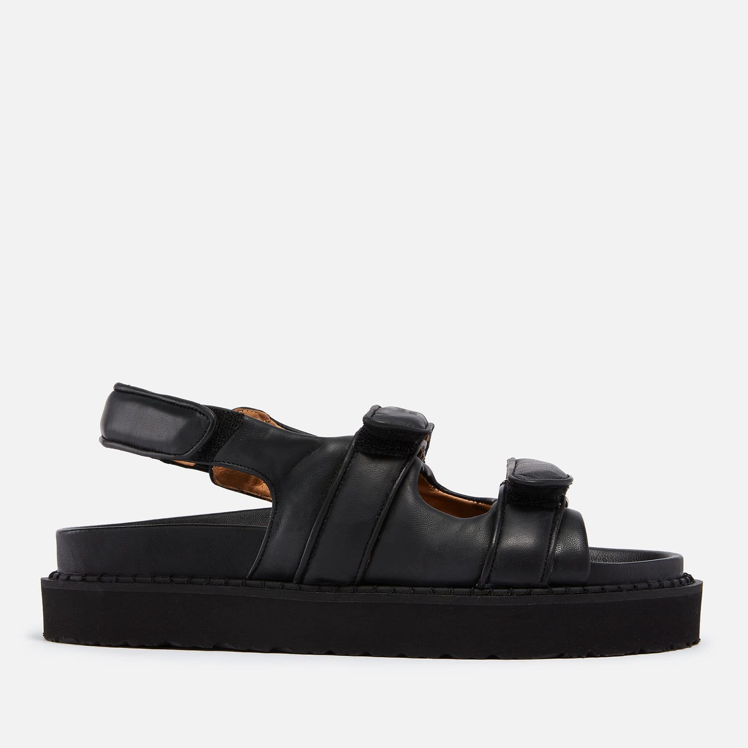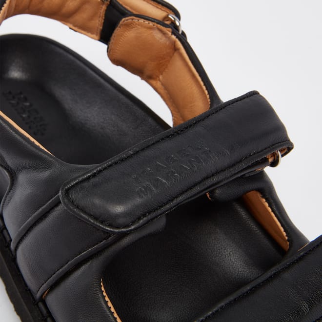 The sandals are made from black leather with a chunky platform sole and feature two adjustable Velcro straps on the upper and a single Velcro strap at the heel for a secure fit. The design also includes a moulded footbed and a treaded rubber sole for comfort and grip. The Isabel Marant logo is embossed on the top strap and the footbed. -