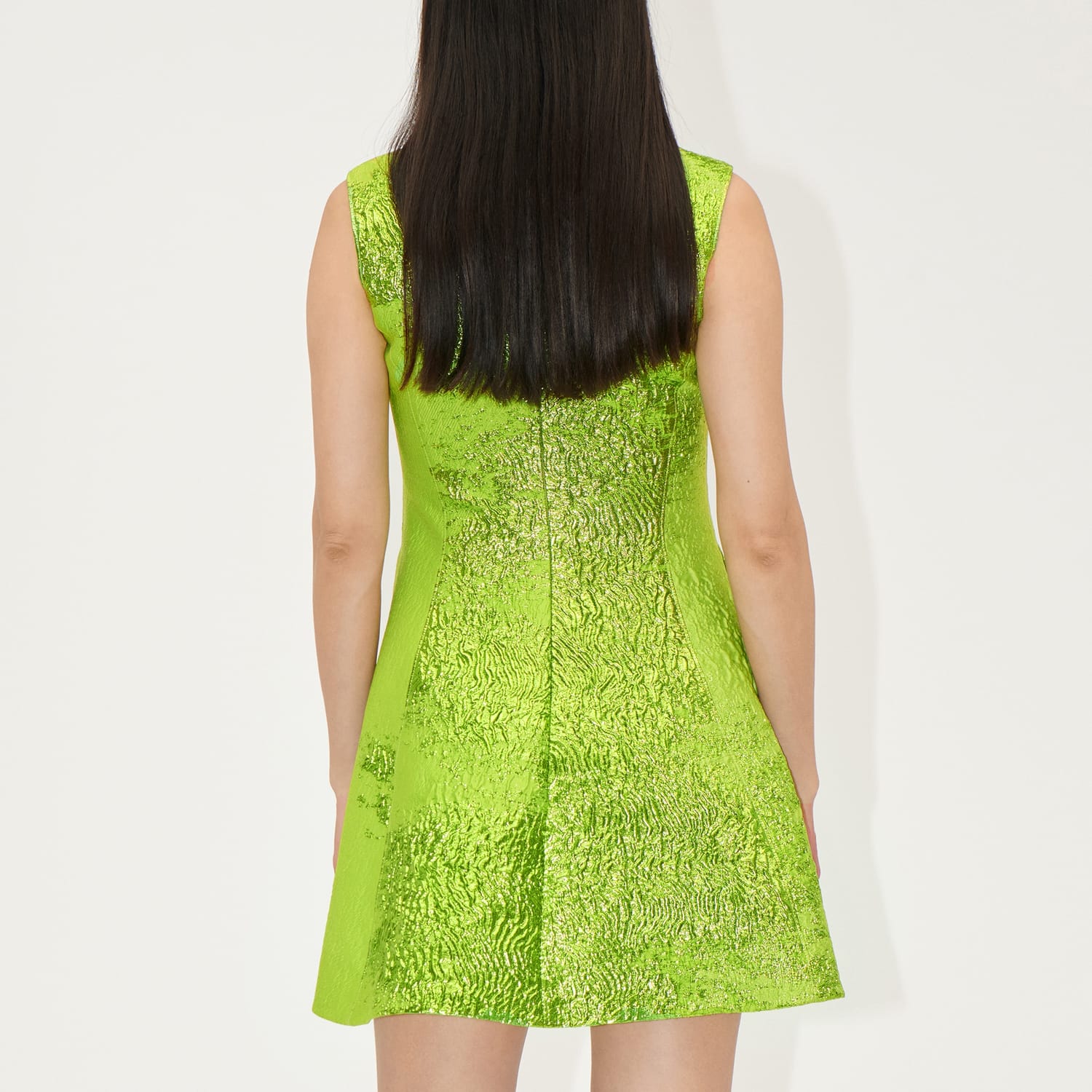 This is a structured sleeveless skater mini dress with a round neckline and side pockets. It has a fit and flare silhouette and an all-over vivid metallic green pattern. -