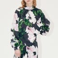 Floral pattern, high neckline, and voluminous sleeves with gathered cuffs. It is described as having a relaxed fit and a flowy silhouette. The brand is known for its use of vibrant colors, unique prints, and artistic designs. -