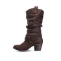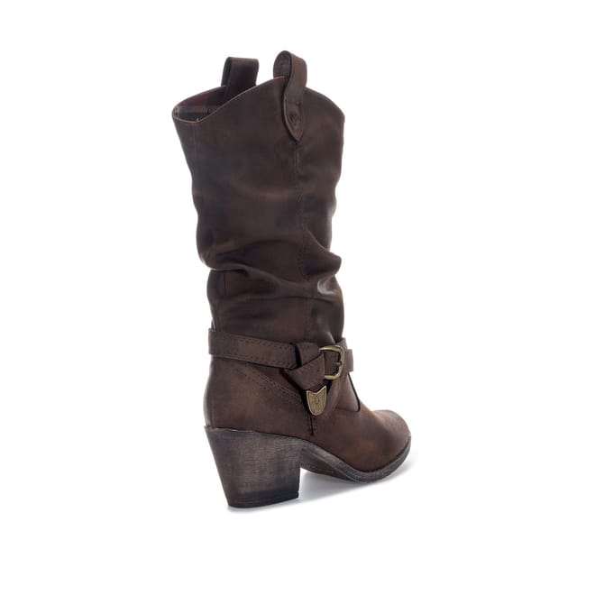 - Calf height pull on western style boot with buckle detail.