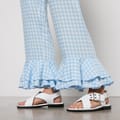 It is a two-piece loungewear set featuring a blue and white gingham check pattern. The folk-inspired blouse has a wide neckline with a tie closure and puffed sleeves with ruffled cuffs and drawstrings. The high-waisted pants have a wide silhouette and flared, ruffled hems. -