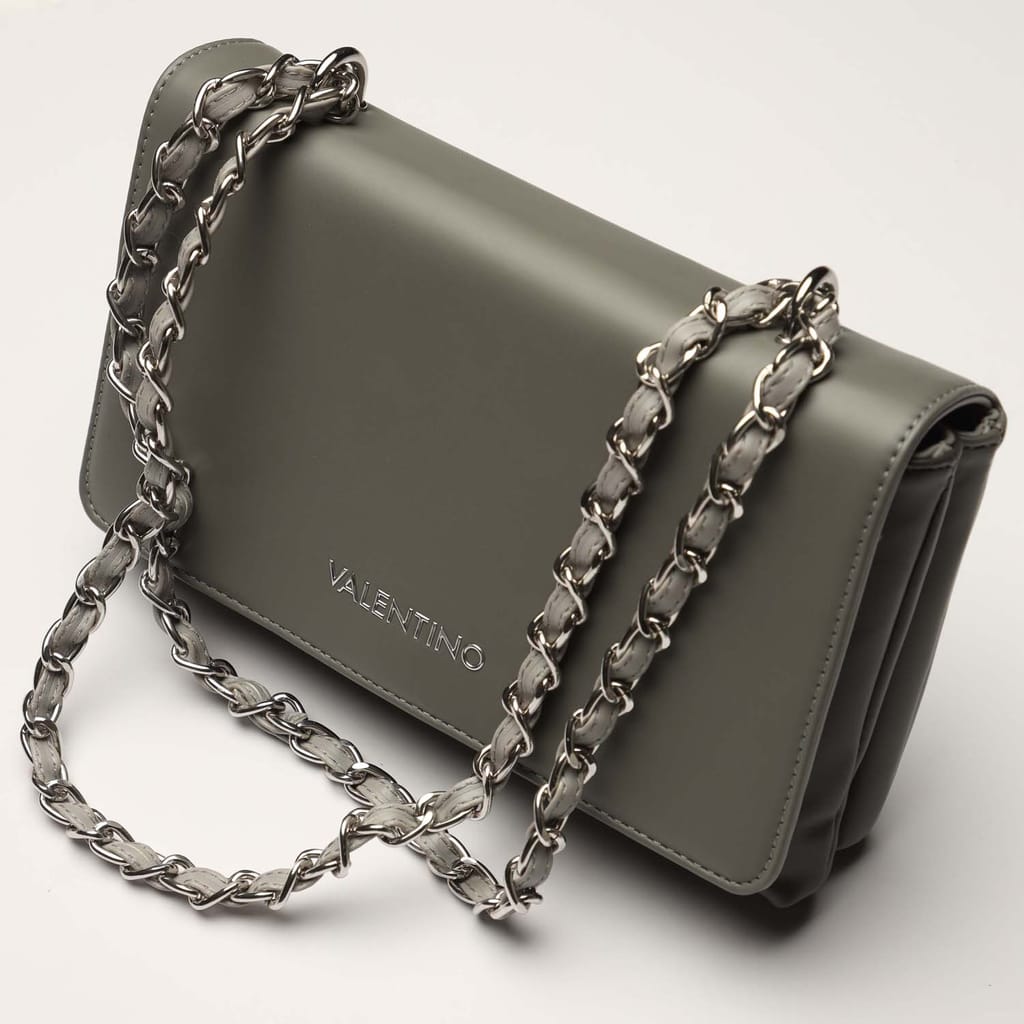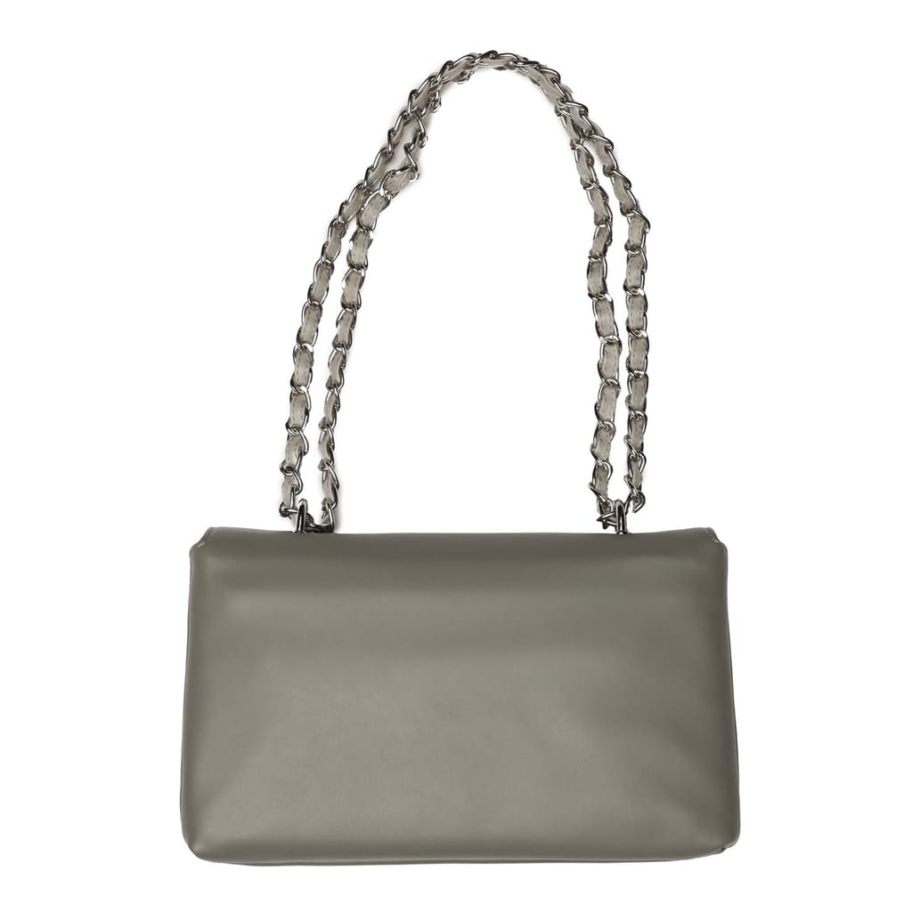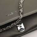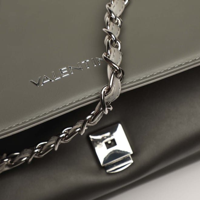 Chain strap, silver-toned hardware, two zipped compartments. Front flap magnetic closure. Faux leather. Dimensions: H: 12.5cm x W: 20cm x D: 6.5cm. -