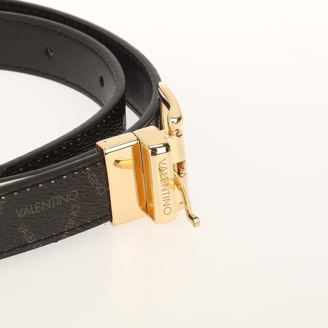 Adjustable keyhole fastening. Gold buckle detail. Embossed logo all over. Faux leather. -