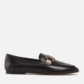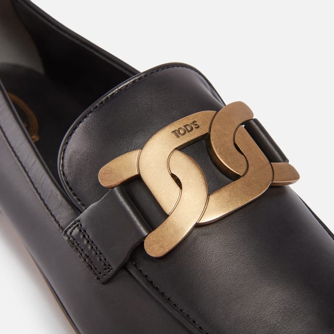 They are made from smooth or polished calfskin leather and feature a sleek, gold-tone chain detail across the vamp. The loafers have a round or almond-shaped toe and a low, flat heel. -